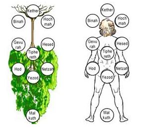 –Dans le sens descendant du Ciel vers la Terre, les dix sephirot symbolisent les divers degrés de la manifestation divine, aussi bien au niveau de l’univers (macrocosme) que de l’être (microcosme). Selon la Kabbale hébraïque, l’univers et les êtres ont été formés à partir du morcellement de l’être primordial, l’état Adamique. Les degrés supérieurs des sephirot correspondent aux principes à la source de la manifestation et sont associés aux racines de l’arbre; les degrés inférieurs sont en relation avec la manifestation elle-même symbolisée par le feuillage de l’arbre. Il s’agit en conséquence d’unarbre inversé représentatif de la Volonté du Ciel sur la Terre;